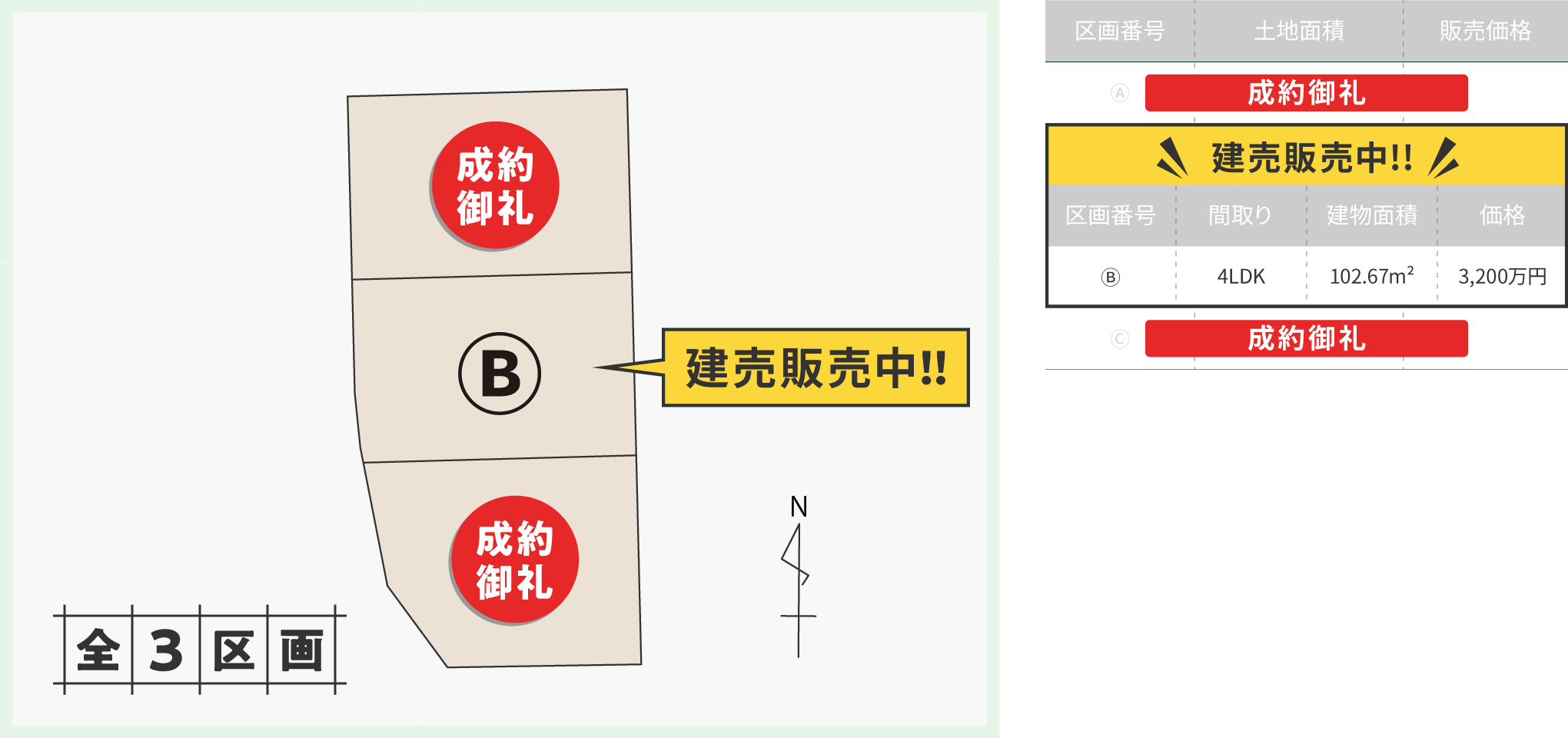 | 販売価格 | Ⓐ成約済 Ⓑ建売 3,200万円 Ⓒ成約済 |