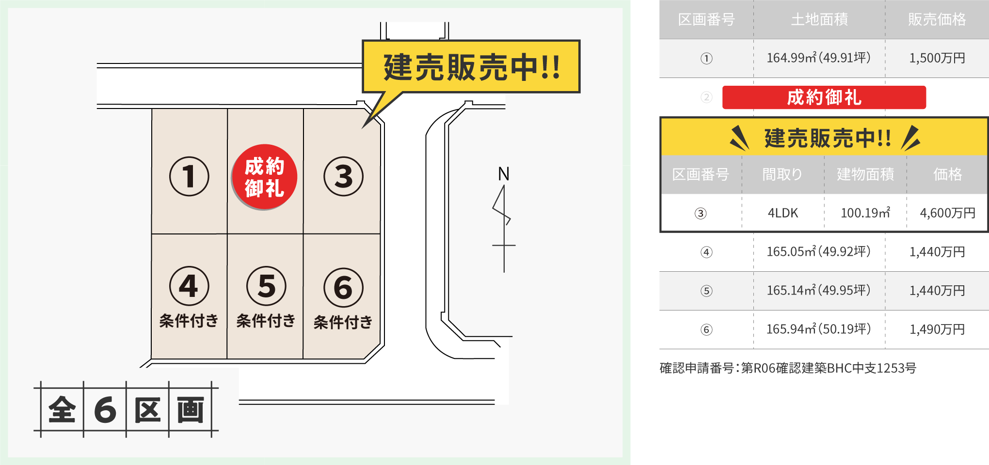| 土地面積 | ①164.99㎡(49.91坪) ②成約済 ③165.85㎡(50.17坪) ④165.05㎡(49.92坪) ⑤165.14㎡(49.95坪) ⑥165.94㎡(50.19坪) |