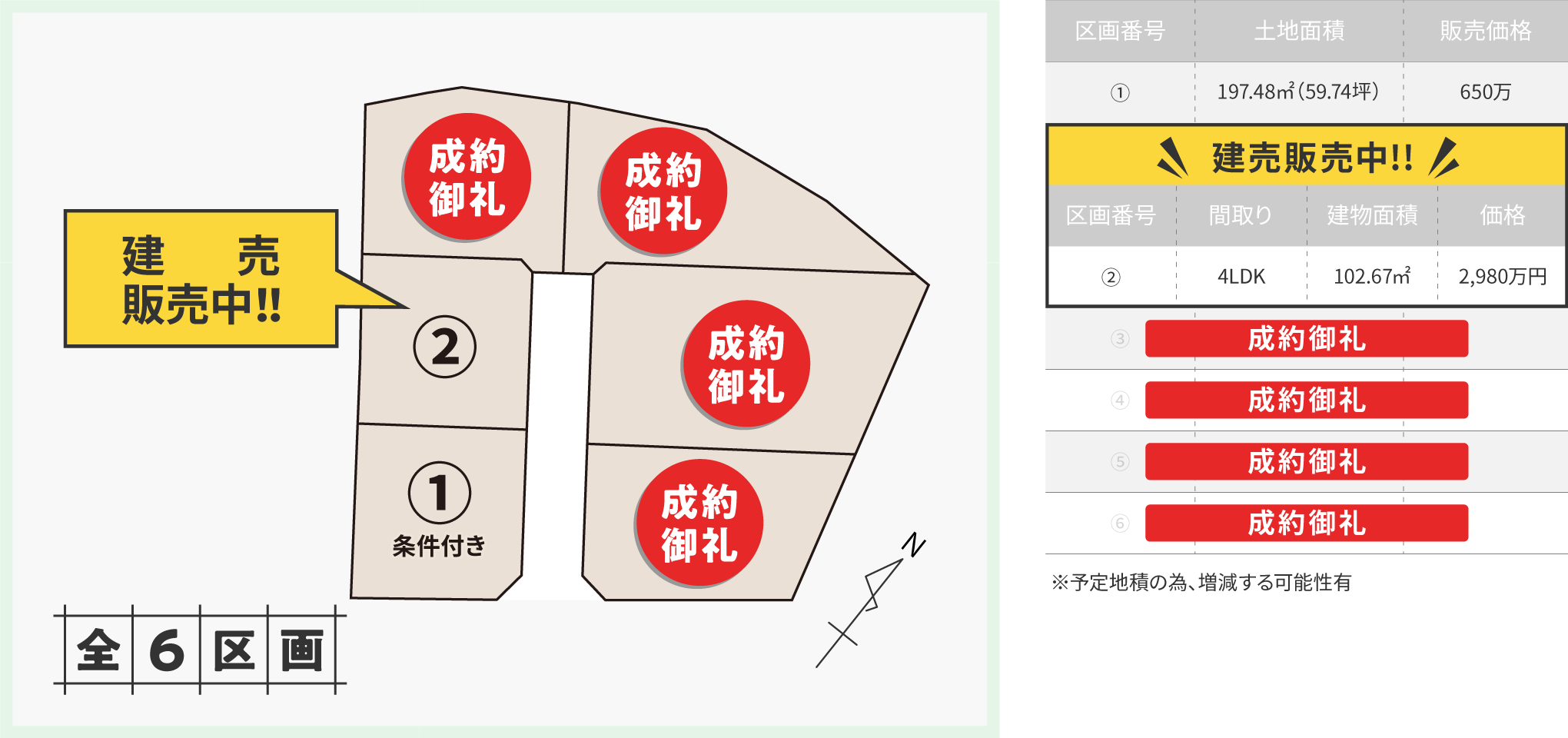 | 土地面積 | ①197.48㎡(59.74坪)②建売 196.05㎡(59.31坪)③成約済④成約済⑤成約済⑥成約済※予定地積の為、増減する可能性有 |